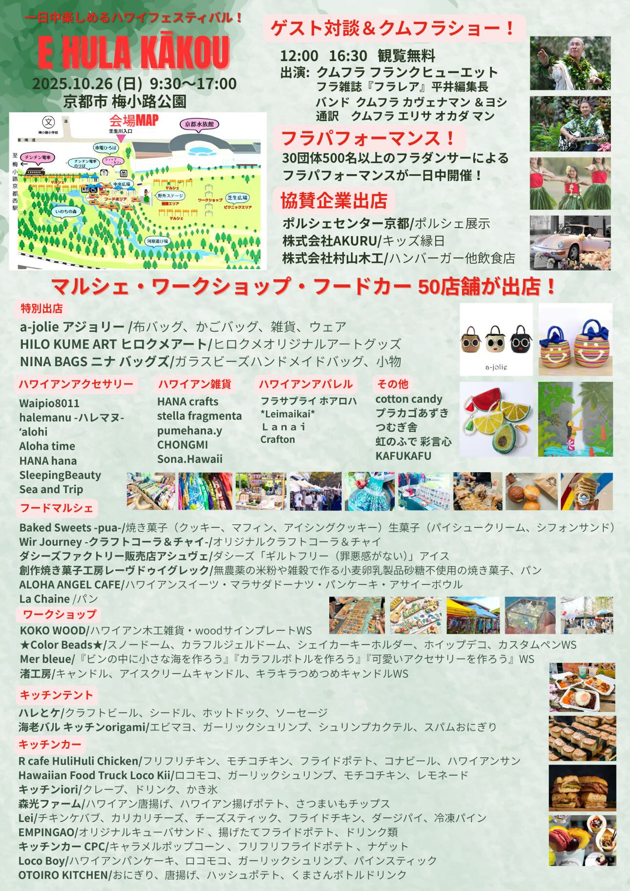 『エフラカコウ』では、ハワイで古来より受け継がれてきたハワイの文化芸能『フラ』に特化し、スペシャルゲストとしてハワイよりレフア カヴァイカプオカラニヒューエット氏をお迎えして、スペシャルゲストフラショーを無料でご覧頂きます。