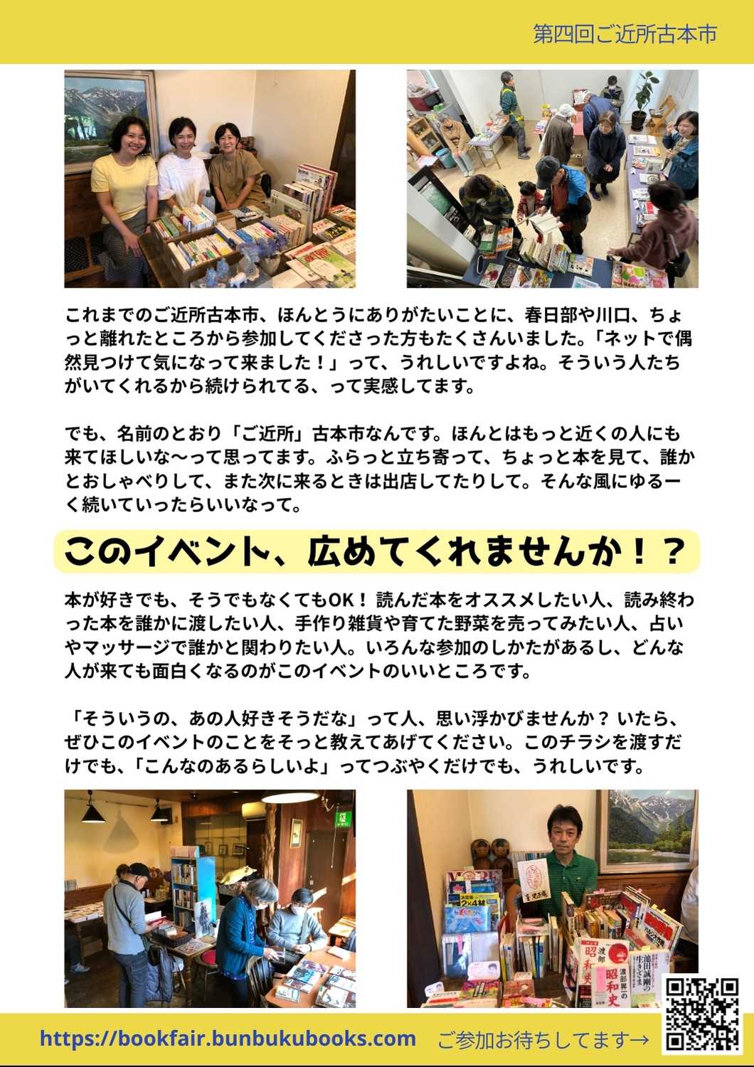 • 出店者募集: 古本はもちろん、雑貨・野菜・占い・ワークショップなども歓迎(出店料:500円)