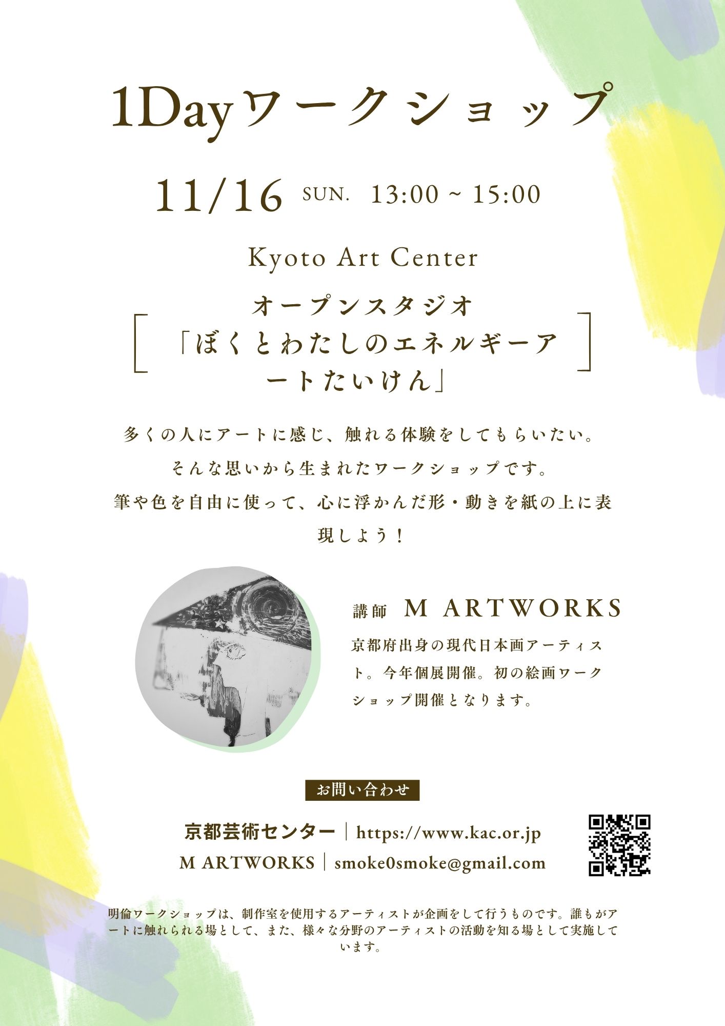 日本画家・現代アーティストの"M ARTWORKS(エム アートワークス)"は、京都芸術センター制作室にて、新作シリーズ「新たなる放出」の制作過程を一般公開するオープンスタジオと、来場者参加型のアートワークショップを開催いたします。
