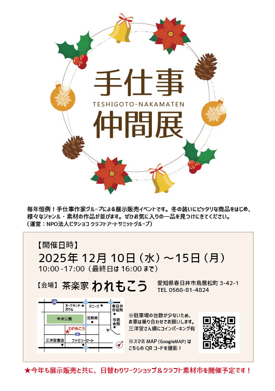 毎年クリスマス前の恒例!春日井にある喫茶&ギャラリー「われもこう」さんで6日間にわたり開催される、手仕事作家グループの合同展示販売イベントです。