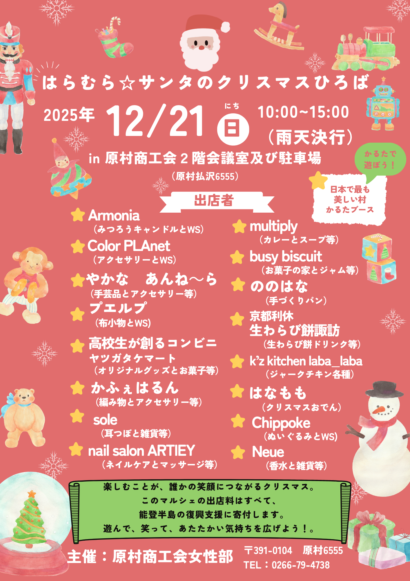 楽しむことが、誰かの笑顔につながるクリスマス。 このマルシェの出店料はすべて、能登半島の復興支援に寄付します。 遊んで、笑って、あたたかい気持ちを広げよう!