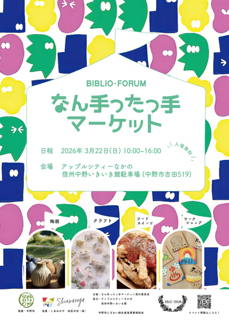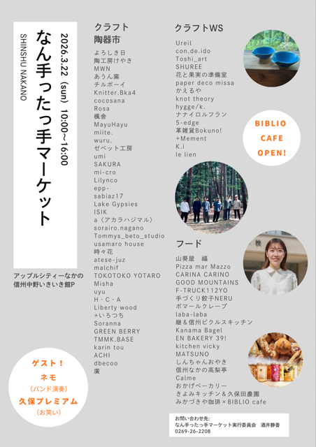 長野県中野市でクラフトの魅力が集まる「なん手ったっ手マーケット」を開催します。会場はアップルシティ&信州中野いきいき館駐車場。 手仕事の温もりあふれる作品や作り手との出会いを楽しめるマーケットです。ゲストにバンドやお笑いも!ぜひお気軽にお立ち寄りください。