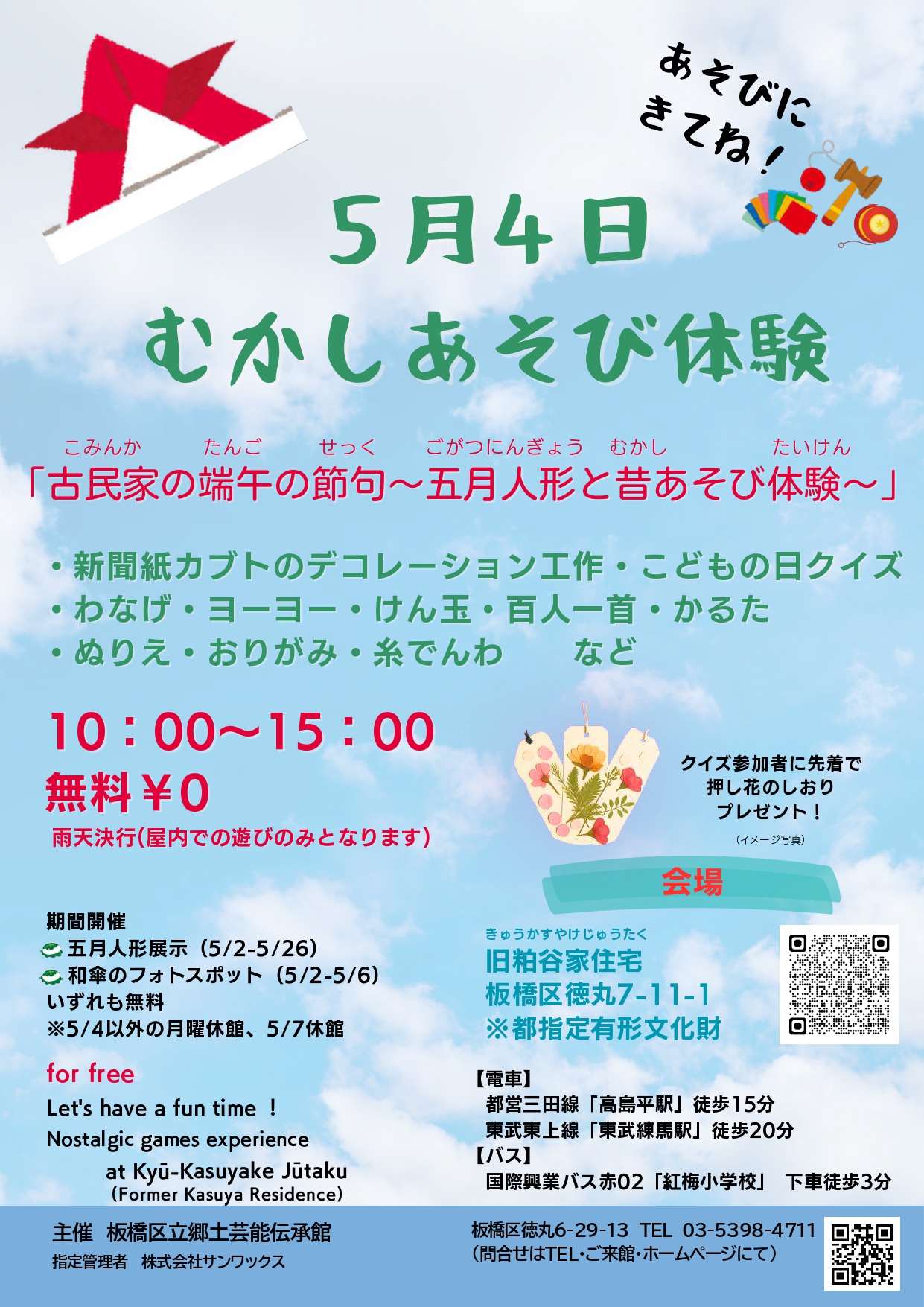 • 雨天決行(雨天時は屋内遊びのみ)会場:旧粕谷家住宅(都指定有形文化財)  ※駐輪スペースあり。駐車スペースなし。公共交通機関でお越しください。費用:無料・事前予約不要連動期間開催:①五月人形展示5/2~5/26 ②和傘のフォトスポット5/2~5/6        ①②は5/4以外の月曜休館、5/7休館 問合せ:板橋区立郷土芸能伝承館 (TEL)03-5398-4711(板橋区徳丸6-29-13) https://itabashi-denshokan.com/ ※ホームページ内に問合せフォームあり